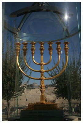 The Jerusalem Menorah, a symbol of the nation of Israel and the mission to be "a light unto the nations." Isaiah 42:6. The seven-branched candelabrum – 7 symbolising "fullness" or "completion" – represents the Spirit of God.